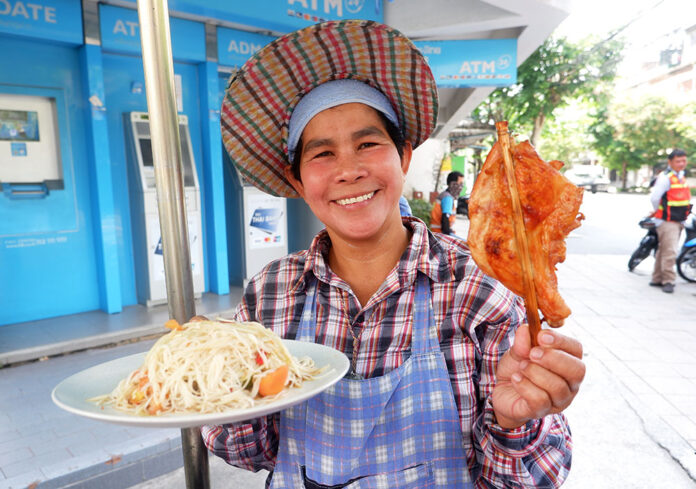 BANGKOK – “Want any grilled chicken and som tum today?” Auntie Yao calls out to familiar faces walking down the street as motorcycle taxi drivers fuel up on grilled drumsticks and plates of pungent fermented papaya salad at her stall.