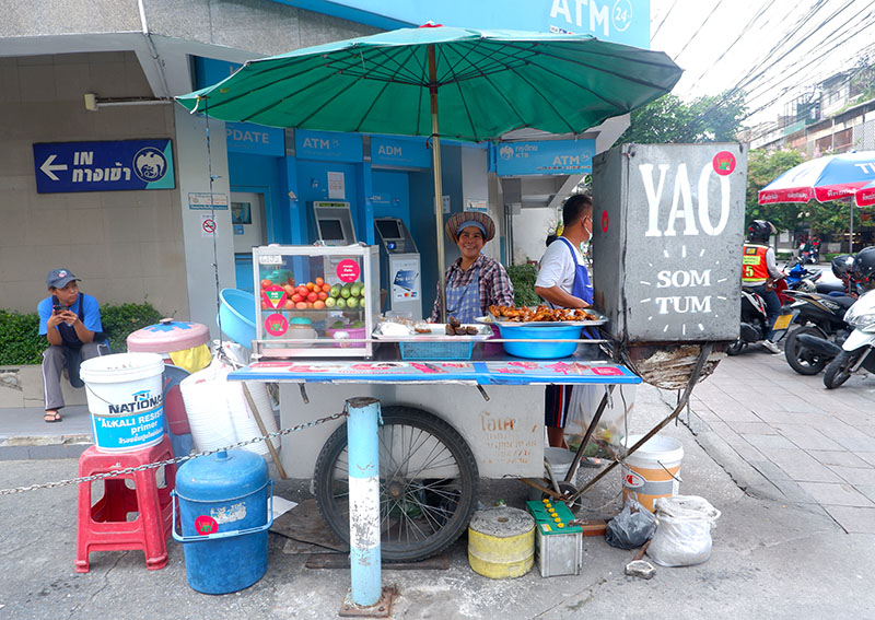 Auntie Yao says she’s been selling chicken and somtum on Nang Linchi for 20 years, but only acquired her spot in front of the Krungthai Branch seven years ago after negotiating with a tessakit officer, or a municipal security officer.