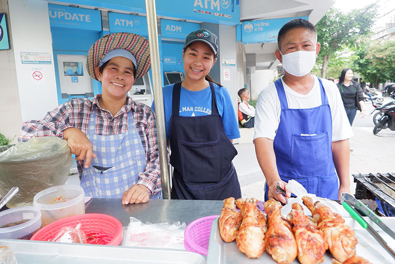 Auntie Yao’s simple cart has remained unadorned for most of her years selling chicken and somtum on the street. But a few weeks ago a group of university students made a sign, a bilingual menu, and a logo for her as part of their homework on marketing.
