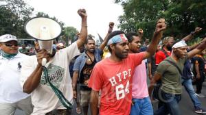 Protesters under the Committee of College Students Against Racism, Capitalism and Colonialism stage a long march from the Indonesian Military (TNI) headquarters to the Merdeka Palace in Jakarta, Wednesday, August 28, 2019. TEMPO/Subekti
