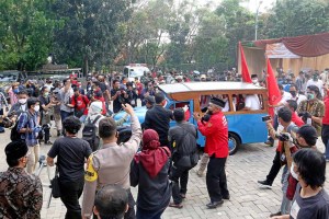 Mayoral candidate Muhamad and his running mate Rahayu Saraswati Djojohadikusumo arrive at the South Tangerang General Elections office on Sept. 4 in an old-fashioned public transportation vehicle known as an “oplet” to register for the December regional election. .(JP/Dhoni Setiawan)