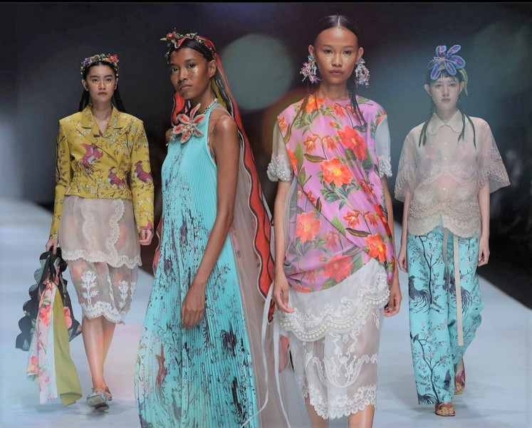 Transcendent: Models on the Indonesian Fashion Forward runway showcase Toton Januar’s collection. Titled Bunga Tidur (Dreams), the summer/spring collection was included in the 2020 Jakarta Fashion Week last year. (Courtesy of Instagram@TotonTheLabel/JFW)