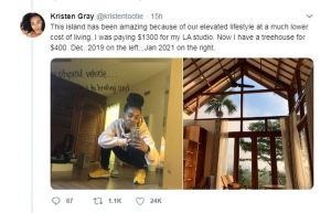 “I was paying $1,300 for my LA studio. Now I have a treehouse for $400. Dec. 2019 on the left… Jan 2021 on the right,” she said of the photos.