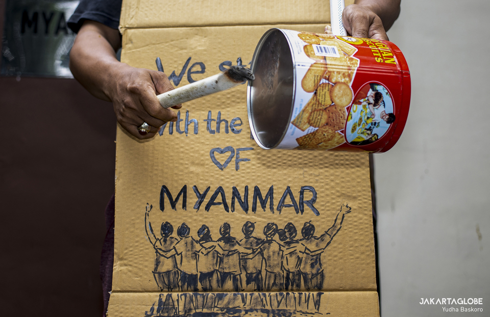 Protester hit an empty cans as a cultural act of solidarity to people of Myanmar in front of the Myanmar Embassy building in Central Jakarta on Feb, 5, 2021. (JG Photo/Yudha Baskoro)