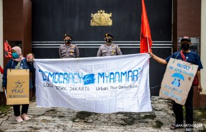 Protesters gathered in front of the embassy at 10.00 a.m., bringing posters and placard that reads sympathy to bring back justice and civil rights in Myanmar. They also demanded that the Myanmar Embassy in Indonesia relay their message to Myanmar’s military junta to return the civilians’ power immediately.