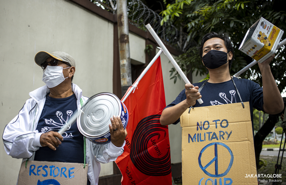 Two protesters hit empty cans during a protest in front of the Myanmar Embassy building in Central Jakarta on Feb, 5, 2021. (JG Photo/Yudha Baskoro)