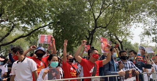 Burmese nationals living in Thailand and pro-democracy supporters gathered in front of the United Nations regional office in Bangkok this afternoon, February 7th, to protest against the military coup in Myanmar and demand the release of the National League of Democracy (NLD) leader Aung San Suu Kyi and other party members being under the military custody.