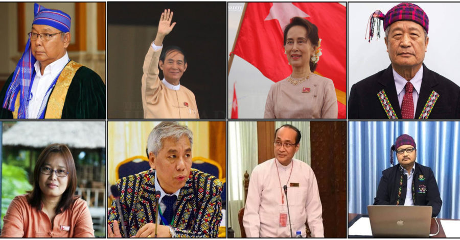 Top row, left to right: Mahn Win Khaing Than, U Win Myint, Daw Aung San Suu Kyi, Duwa Lashi La. Bottom row, left to right: Daw Zin Mar Aung, Dr. Lian Hmung Sakhong, Dr Zaw Wai Soe, Dr. Tu Hkawng