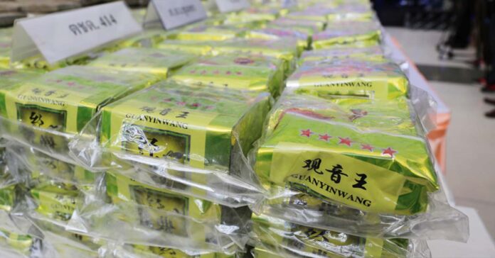 “Authorities in Bangkok, Thailand display a large crystal methamphetamine seizure from the Golden Triangle concealed in Chinese tea bags totaling 700 million baht (US$22.42 million) Photo: UNODC
