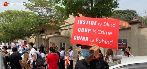 Anti-coup protesters hold placards outside the Chinese Embassy in Yangon. / The Irrawaddy