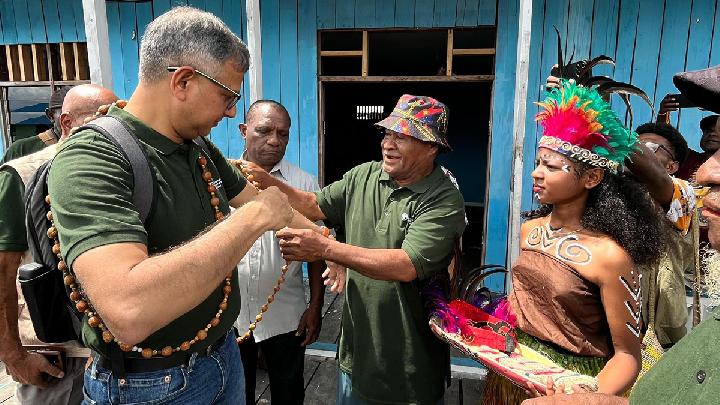 Masyarakat Adat Yoboi welcomes the Food and Agriculture Organization of the United Nations (FAO) Representative in Indonesia and Timor-Leste Rajendra Aryal at the Sago Festival in Yoboi Traditional Village, Jayapura, Papua on Saturday (01/03). The festival is organized by the FAO with Masyarakat Adat Yoboi, Simforo and Babrongko, as well as Strategic Papua Analysis to expand the market of local sago derivatives. (FAO) Doc. UN Indonesia